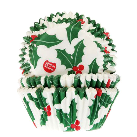 Paquete de 50 capsulas de Navidad para hornear cupcakes o muffins con motivos de Hoja de Acebo en colores verdes, rojos y blancos, del fabricante fabricante House of Marie.