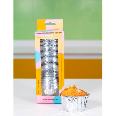 Paquete de 50 capsulas rígidas de cartón con interior metalizado, especiales para hornear cupcakes o muffins de tamaño estándar, del Fabricante Azucren.