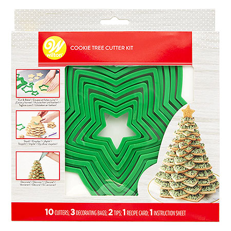Set de Cortadores de Galletas del fabricante Wilton con los que poder elaborar de forma sencilla un precioso árbol de navidad en tres dimensiones. Incluye cortadores, 3 mangas pasteleras, y 2 boquillas para poder decorarlo fácilmente.