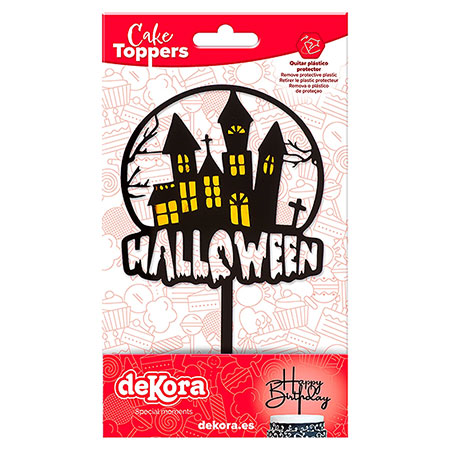 Topper para tartas fabricado en acrílico en color negro, con diseño especial de Halloween, del fabricante Dekora. De excelente calidad, cuenta con un atractivo diseño con motivos de Casa Encantada de Halloween sobre el texto “Halloween”.