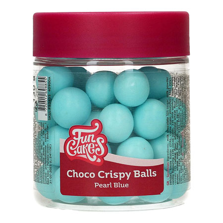 Deliciosas bolas de chocolate con centro crujiente de cereales, en color azul perlado, ideales para decorar todo tipo de postres, del fabricante Funcakes.